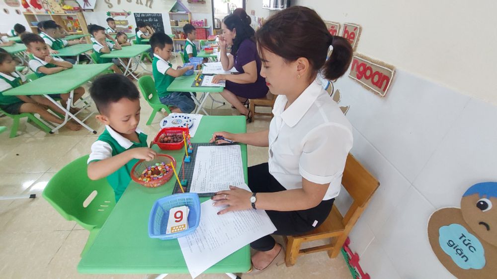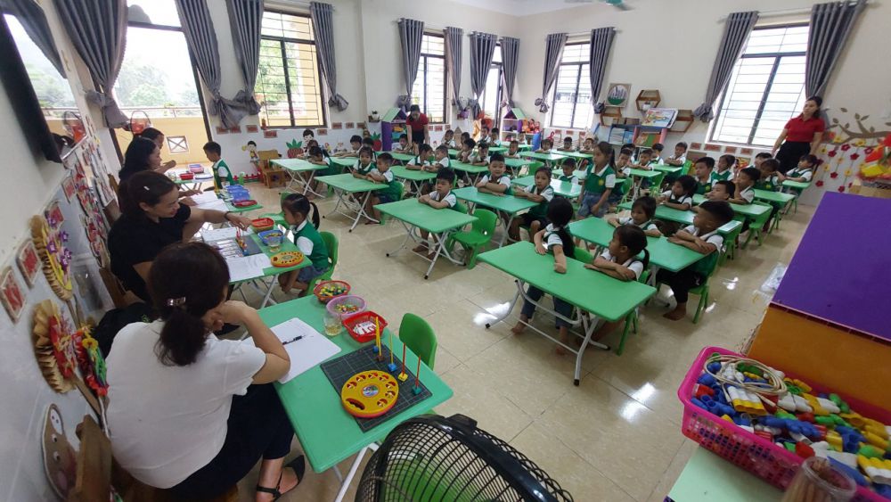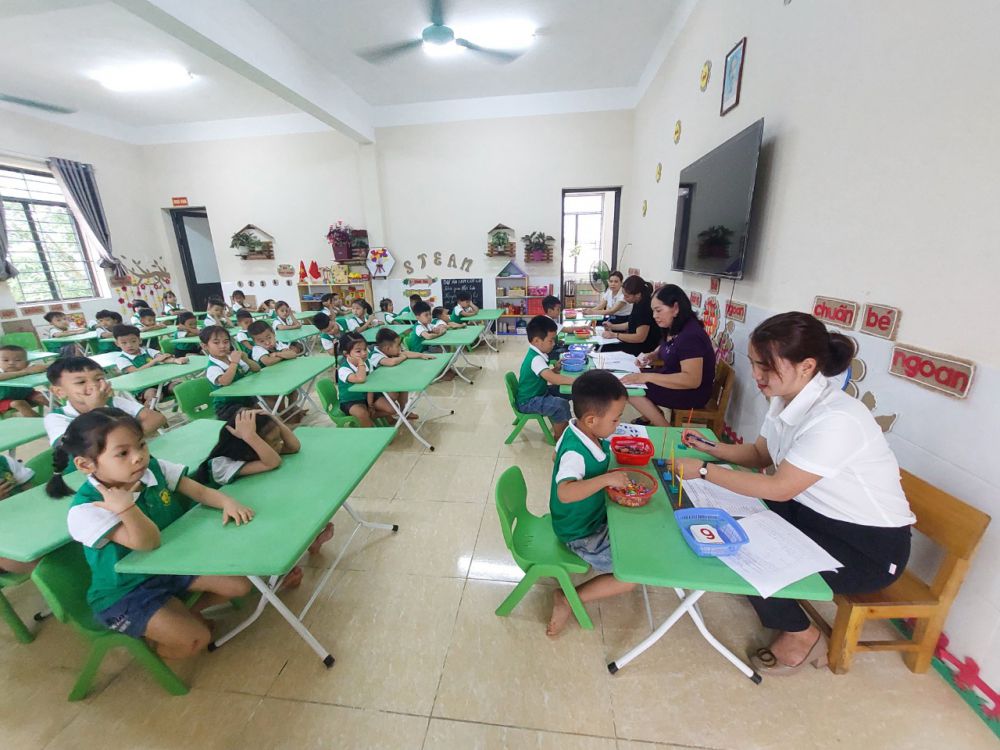 Nội dung đánh giá chủ yếu tập trung vào lĩnh vực phát triển nhận thức và lĩnh vực phát triển ngôn ngữ theo Kế hoạch số 42/KH-PGDĐT ngày 08 tháng 4 năm 2024 của Phòng GD&ĐT Bắc Quang. Qua kiểm tra đa số trẻ biết đếm từ 1 đến 10; nhận biết con số phù hợp với số lượng trong phạm vi 10; tách, gộp 10 đối tượng thành 2 nhóm và so sánh số lượng của các nhóm; Giới thiệu được họ tên, ngày sinh, giới tính và sở thích của bản thân; giới thiệu về các thành viên trong gia đình, địa chỉ của gia đình, kể tên đồ dùng học tập chuẩn bị khi vào lớp 1, nhận biết, phát âm được chữ cái trong bảng chữ cái tiếng Việt, biết cách cầm bút và ngồi đúng quy cách, biết tô chữ cái và số, biết bắt chước hành vi viết và sao chép từ, chữ cái, chữ số và một số ký hiệu.
