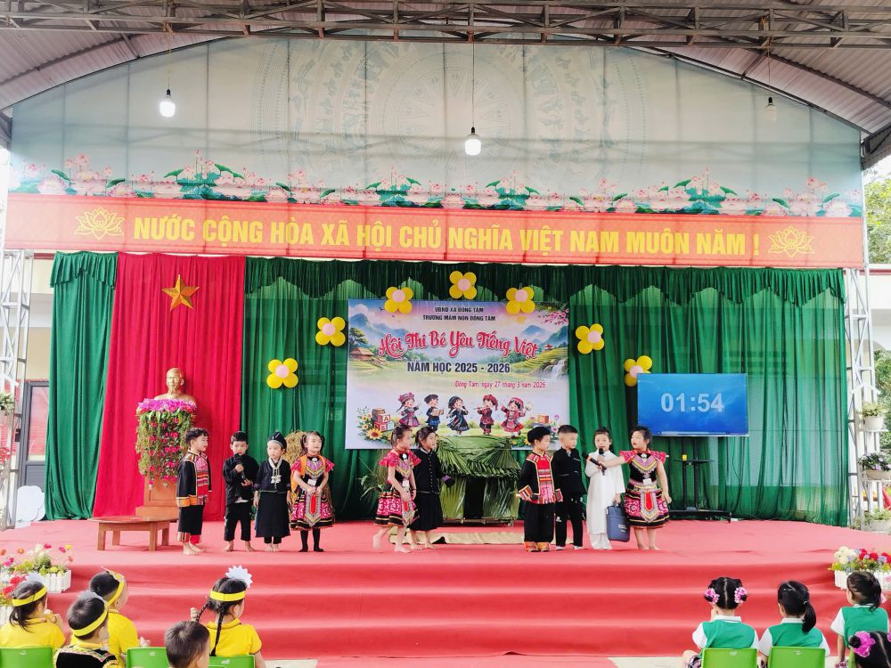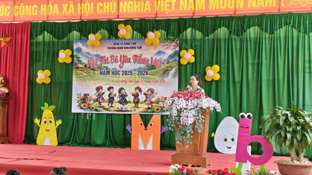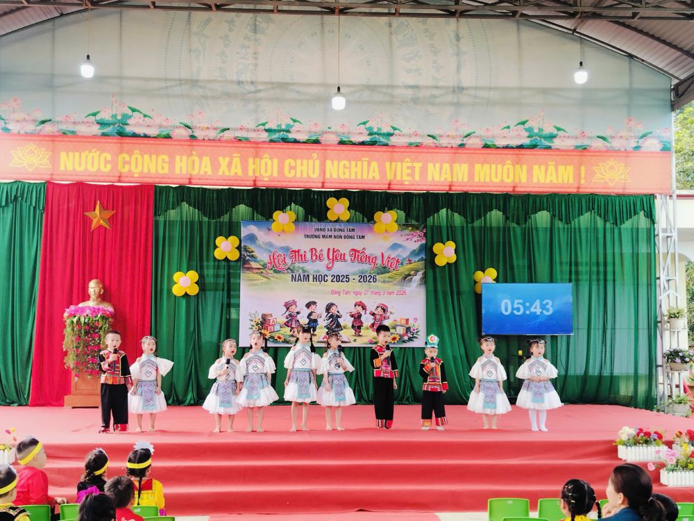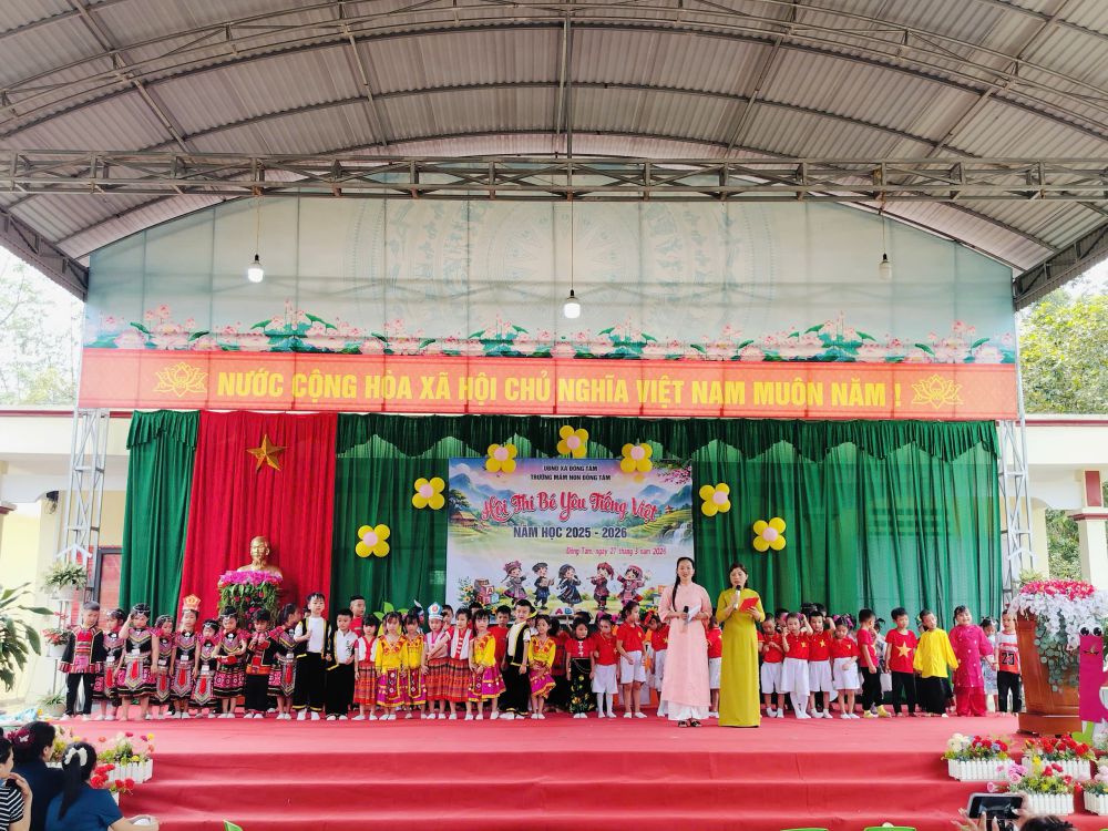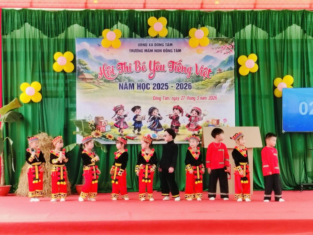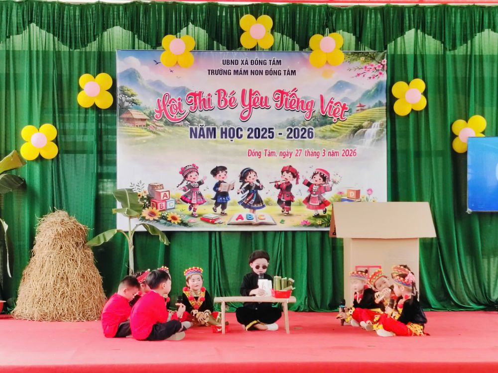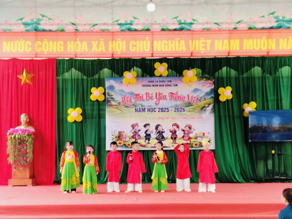 Nhằm thực hiện có hiệu quả chương trình chăm sóc, giáo dục trẻ và tăng cường tiếng Việt cho trẻ mầm non, đặc biệt là trẻ em dân tộc thiểu số, đồng thời tạo sân chơi giúp trẻ mạnh dạn, tự tin trong giao tiếp, sáng ngày 27/3/2026 trường Mầm non Đồng Tâm đã tổ chức thành công Hội thi “Bé yêu tiếng Việt” năm học 2025-2026. Đây không chỉ là sân chơi bổ ích mà còn là hành trình giúp các bạn nhỏ khám phá vẻ đẹp giàu của tiếng Việt, từ đó nuôi dưỡng tình yêu quê hương, đất nước ngay từ lứa tuổi mầm non.
