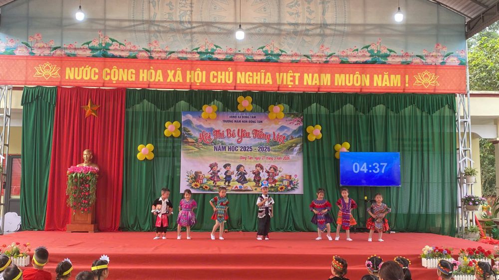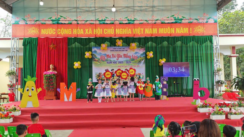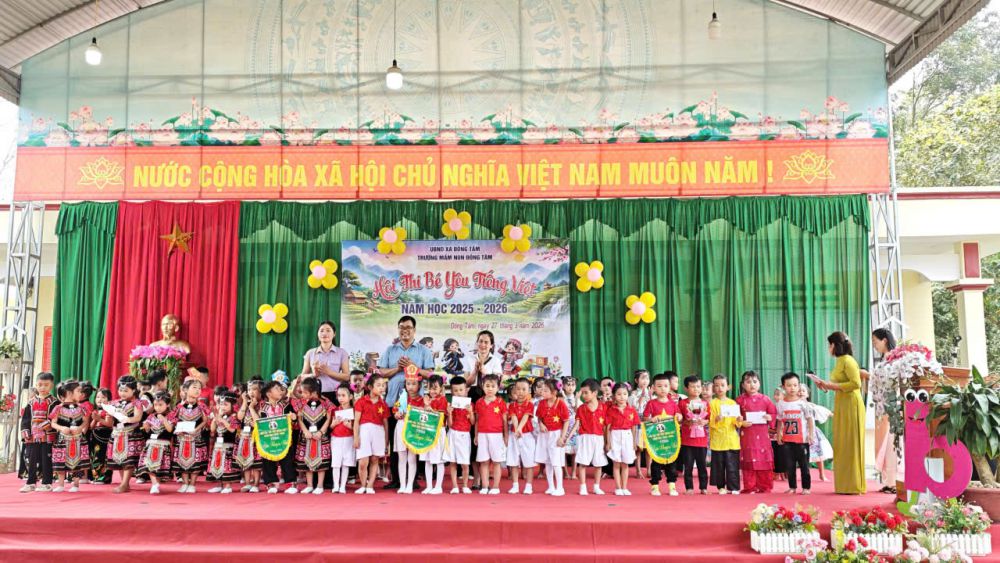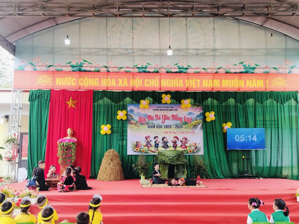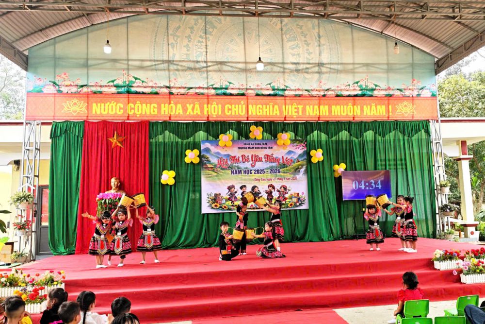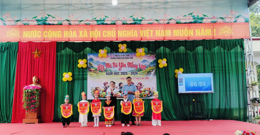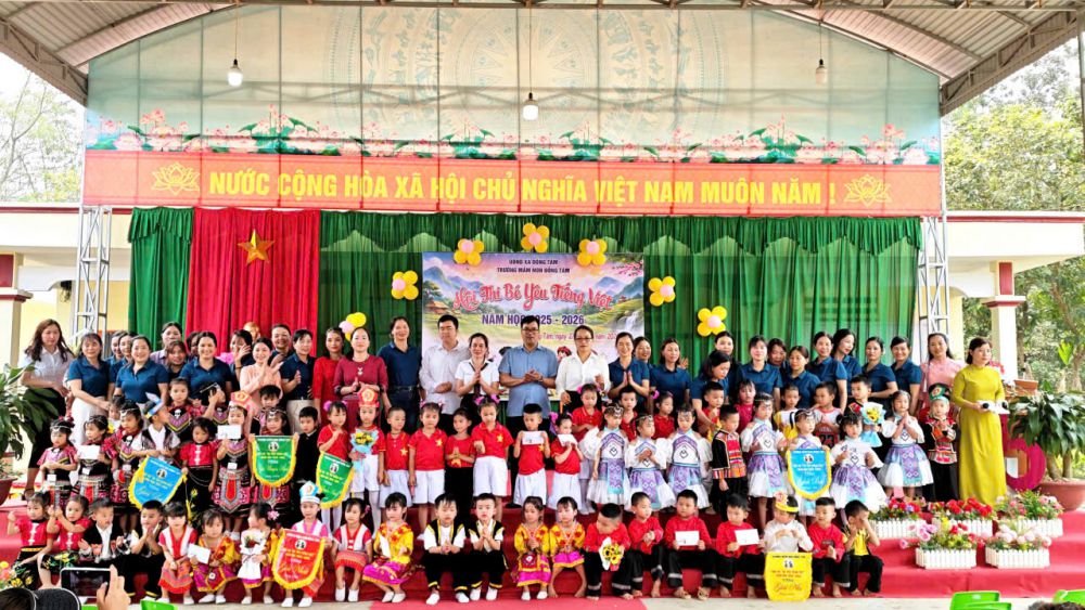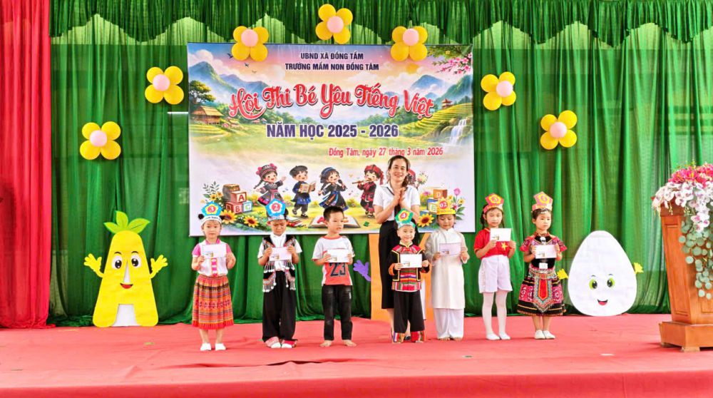 Nhằm thực hiện có hiệu quả chương trình chăm sóc, giáo dục trẻ và tăng cường tiếng Việt cho trẻ mầm non, đặc biệt là trẻ em dân tộc thiểu số, đồng thời tạo sân chơi giúp trẻ mạnh dạn, tự tin trong giao tiếp, sáng ngày 27/3/2026 trường Mầm non Đồng Tâm đã tổ chức thành công Hội thi “Bé yêu tiếng Việt” năm học 2025-2026. Đây không chỉ là sân chơi bổ ích mà còn là hành trình giúp các bạn nhỏ khám phá vẻ đẹp giàu của tiếng Việt, từ đó nuôi dưỡng tình yêu quê hương, đất nước ngay từ lứa tuổi mầm non.